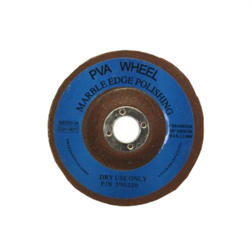 Four inch diameter dry grindingwheel for dry marble polishing, especially for bullnose and flat edge polishing. Formulated with a silicon carbide abrasive and a polyvinyl alcohol bond that is color-coded for ease of operation. Also be used on the edges of ceramics, wood and metal or for paint removal as the material will not clog.