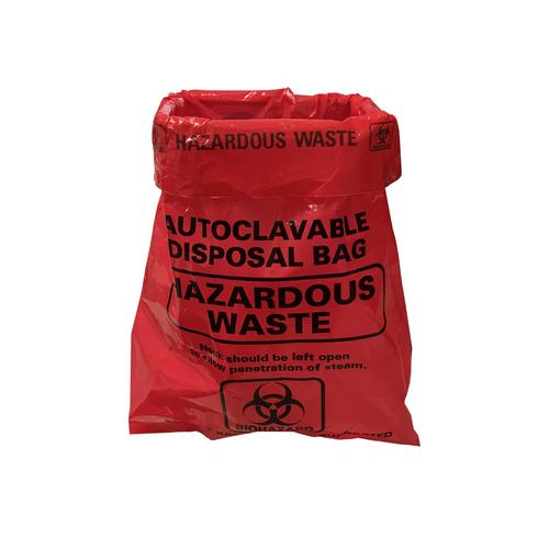 These high temperature autoclavable bags are manufactured from heavy gauge polypropylene material that is not only more puncture-resistant than polyethylene, but also withstands autoclaving at temperatures up to 136°C (250°F). Their ability to contain is completely unaffected at standard autoclave temperature (121°C). Each bag has an oversized white marking panel, suitable for use with all types of permanent markers. They are also prominently marked with the words "Hazardous Waste" and the standard "Biohazard" symbol, conforming to the OSHA standard.