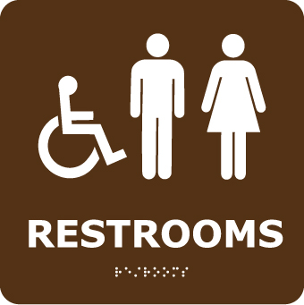 NMC, ADA9WBR, Ada Braille Sign "Restrooms (w/Handicap Symbol)"/ Brown
