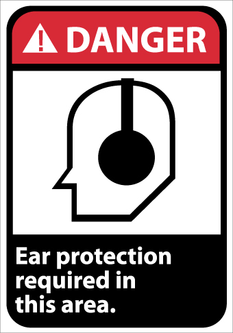 NMC, DGA4RB, 14"x 10"ANSI Sign w/Legend: "Danger - Ear Protection Required In This Area (w/Graphic)"