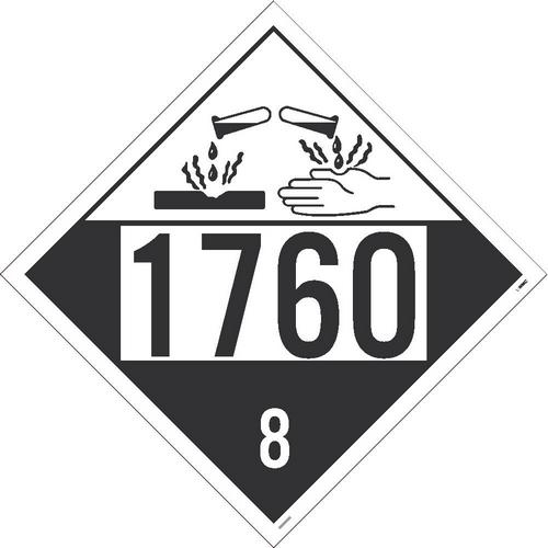 Corrosive materials can cause long lasting injuries. Prevent a terrible accident by posting our 1760 8 DOT Placard sign on vehicles or containers carrying caustic substances.