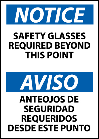 NOTICE, SAFETY GLASSES REQUIRED BEYOND THIS POINT BILINGUAL, 14X10, RIGID PLASTIC