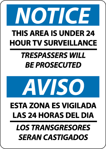 NOTICE, THIS AREA IS UNDER 24 HOUR TV SURVEILLANCE, BILINGUAL, 14X10, RIGID PLASTIC