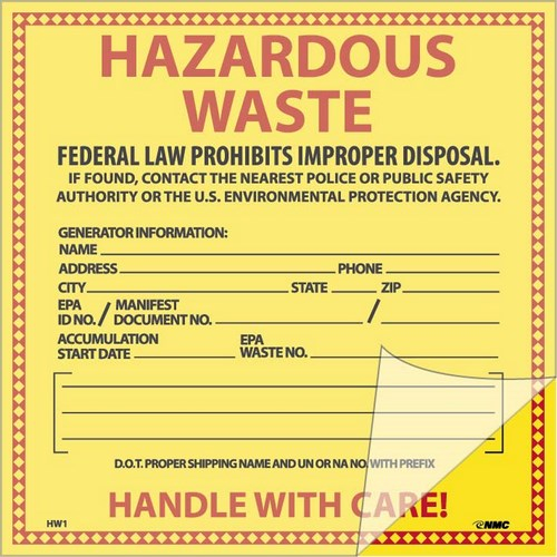 NMC, HW1SL25, 6"x6" Pressure Sensitive Vinyl Self Lamination "Hazardous Waste" Label