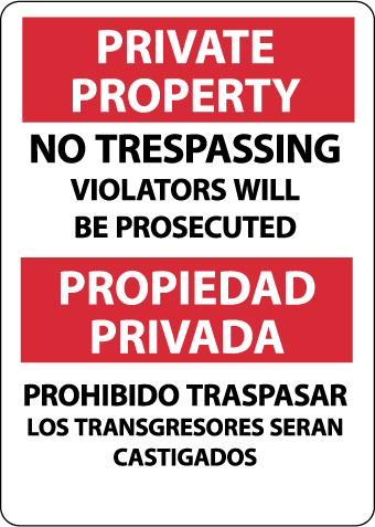 Private Property No Trespassing Violators Will Be Prosecuted, Bilingual, 14X10, Rigid Plastic