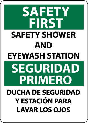 NMC, M735AB, 14" x 10" Emergency and First Aid Sign - "Safety First Safety Shower and Eyewash Station, Bilingual", Aluminum
