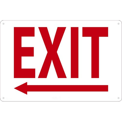 Direct everyone in your facility towards safety with this exit sign. Available in a vast number of sturdy materials, this sign's arrow points left to guide viewers out of the facility. .040 aluminum has baked-on enamel on both sides, allowing it to be printed on both sides. It is weatherproof and non-corrosive, making it ideal for indoor and outdoor use. Signs are supplied with radius corners and pre-drilled mounting holes. Excellent for placement on a wall or fence.