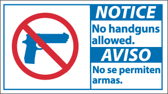 Notice, 10 X 18 Notice No Handguns Allowed/Aviso (Bilingual W/Graphic), 10X18, Rigid Plastic