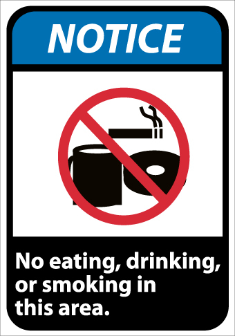 NMC, NGA5PB, 14"x 10"ANSI Sign w/Legend: "Notice - No Eating Drinking Or Smoking In This Area"