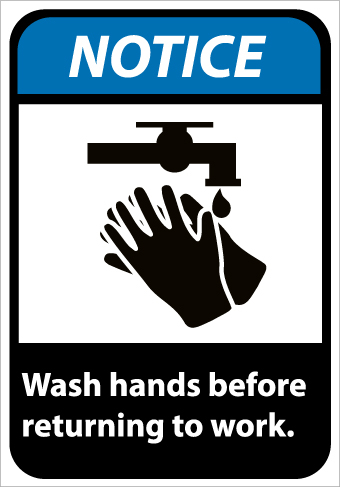 NMC, NGA7P, 10"x 7"ANSI Sign w/Legend: "Notice - Wash Hands Before Returning To Work (w/Graphic)"
