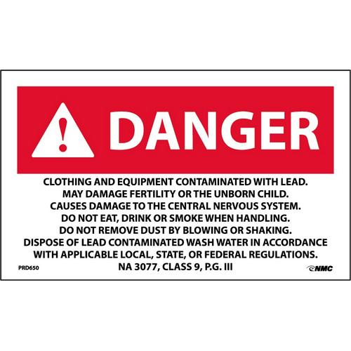 NMC, PRD650, 3" x 5" "Danger Clothing and Equipment Contaminated with Lead" Ps Paper Label