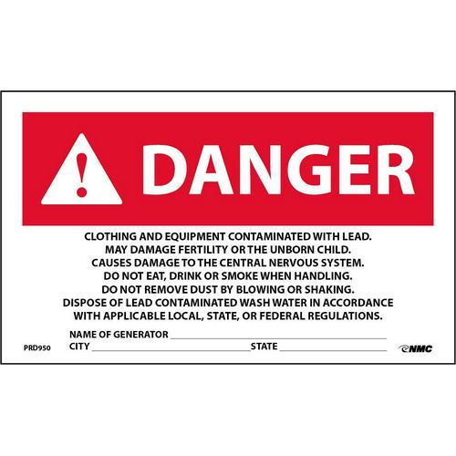 NMC, PRD950, 3" x 5" "Clothing and Equipment Contaminated with Lead" Ps Paper Label