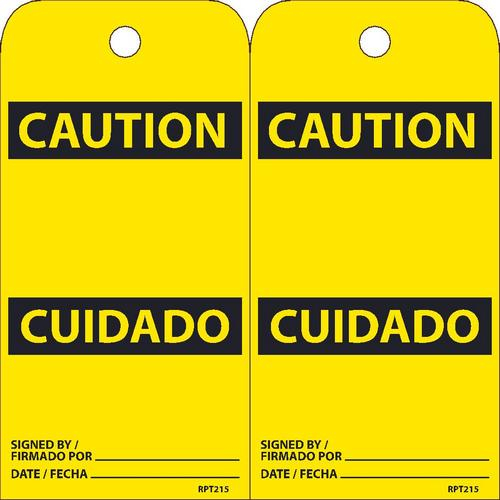 Tags, Caution, Blank, Bilingual, 25pk, 6x3, .015 Unrippable Vinyl With 1 Top Center Hole, Zip Ties Included