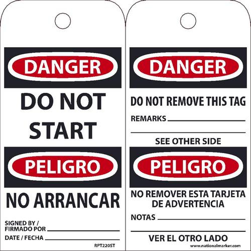 NMC, RPT220ST, "Danger Do Not Start" Bilingual Tag, .015 Unrippable Vinyl, Grommet