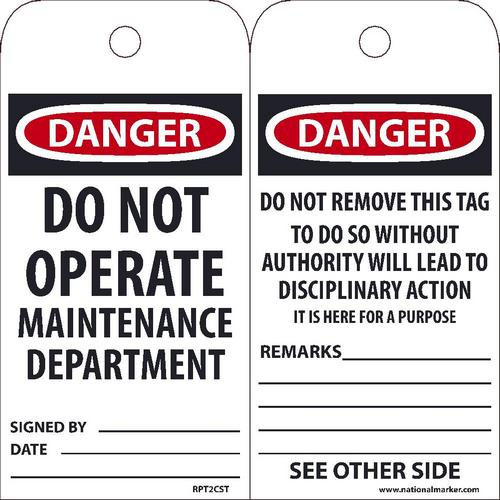 NMC, RPT2CST, "Danger Do Not Operate" Tag, .010 Synthetic Paper, 1 Top Center Hole