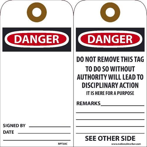 NMC, RPT30CG, "Danger Signed" Tag, .015 Unrippable Vinyl With Grommet