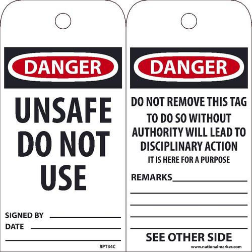 NMC, RPT34C, "Danger Unsafe Do Not Use" Tag, Vinyl with 1 Top Center Hole