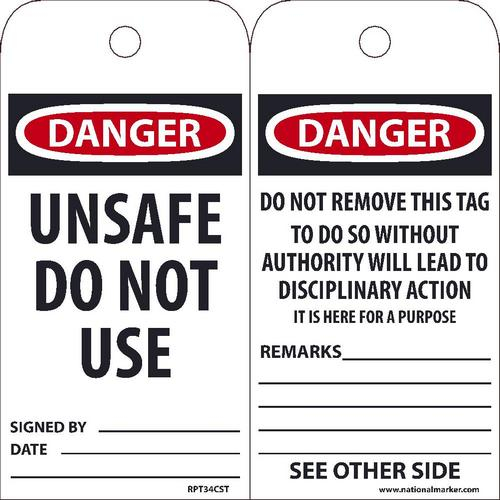 NMC, RPT34CST, "Danger Unsafe Do Not Use" Tag, Synthetic Paper, 1 Top Center Hole