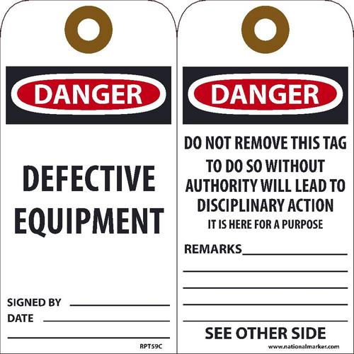 Tags, Danger Defective Equipment Tag, 25pk, 6x3, .015 Unrippable Vinyl With Grommet, Zip Ties Included