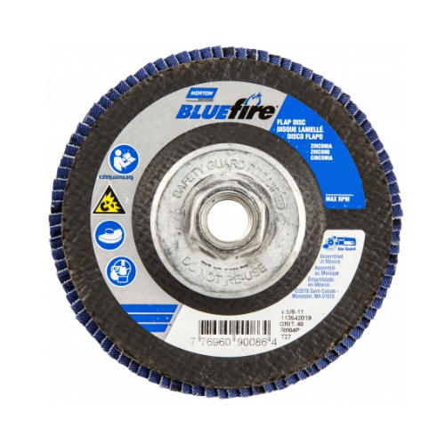 Designed to last up to 30 percent longer than competitors zirconia alumina disc, the Blue Fire R884P coarse grit arbor thread plastic heavy duty flat flap disc fits right angle grinders for use on stock removal, blending, beveling and deburring applications. The zirconia alumina abrasive produces great cutting action and the lightweight fiberglass and resin backing plates minimize vibration for optimal operator comfort. A versatile disc that can handle a wide assortment of metals, the R884P features high-density jumbo semi-open flaps that ensure minimal loading when working with soft metals.