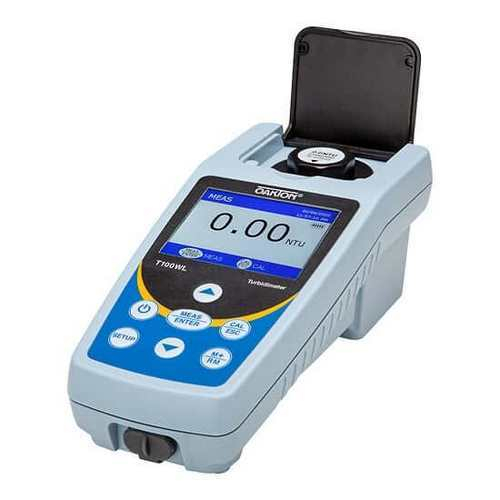 The Oakton T-100 series portable turbidity meters feature five calibration points - 0 NTU, 20 NTU, 100 NTU, 400 NTU, and 800 NTU. The 0 NTU uses laboratory distilled or deionized water, while the other four calibration points are configured using high molecule polymer standard solutions included in the kits. The meters also include normal and continuous measurement modes, parameter setup, data recall, real-time clock, calibration date check, automatic power off, and low voltage indication. The continuous measure mode allows you to automatically generate average, maximum and minimum measured values in a data storage interface, suitable for sample solutions with rapid settling and continuous measurement changes. The large TFT color screen displays a blue background for measurement mode, green background for calibration mode, and features operation guides for easy calibration and measurement. Up to 200 sets of data can be stored on the meter. A USB interface cable can transfer this data to your computer for future analysis.