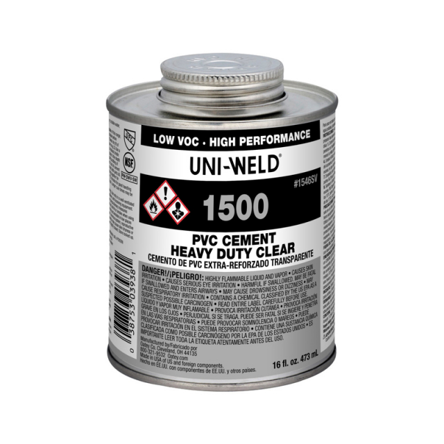 Oatey® 1500 Series PVC Heavy Duty Clear Cement is formulated for use on all schedules and classes of PVC pipe and fittings up to 12" diameter with interference fit, up to 18" for non-pressure.