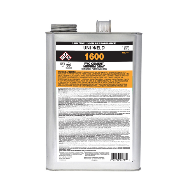 Oatey® Uni-Weld 1600 Series PVC Medium Gray Cement is formulated for use on all schedules and classes of PVC pipe and fittings up to 6" diameter with interference fit.
