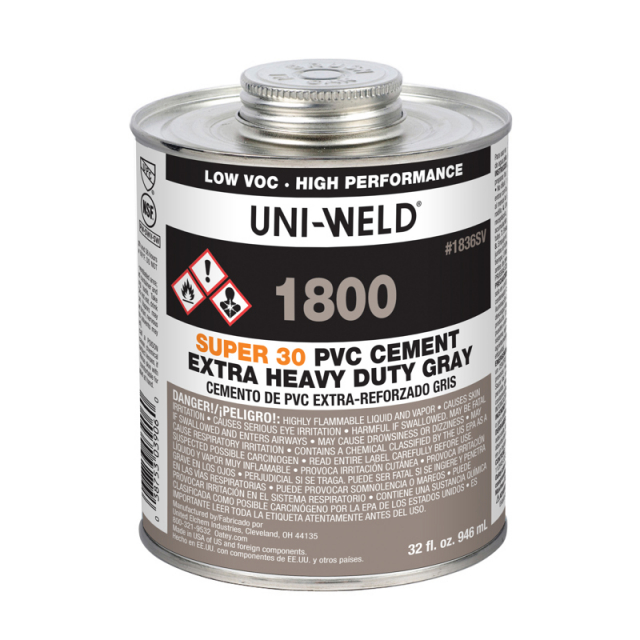 Oatey® 1800 Series Super 30® PVC Cement is an extra heavy-bodied, medium-setting gray cement formulated for quick installation of PVC pipe and fittings up to 30" diameter.