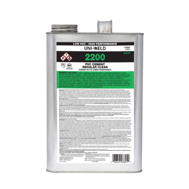 Oatey® PVC Uni-Weld® 2200 Series Regular Bodied Fast Set Clear Cement is recommended for potable water, pressure pipe and DWV applications. It can be used for use on all schedules and classes of PVC pipe and fittings up to 4 in. for Sch. 40 and up to 2 in. for Sch. 80 with interference fit. Oatey products have earned the trust of plumbing professionals for over 100 years.