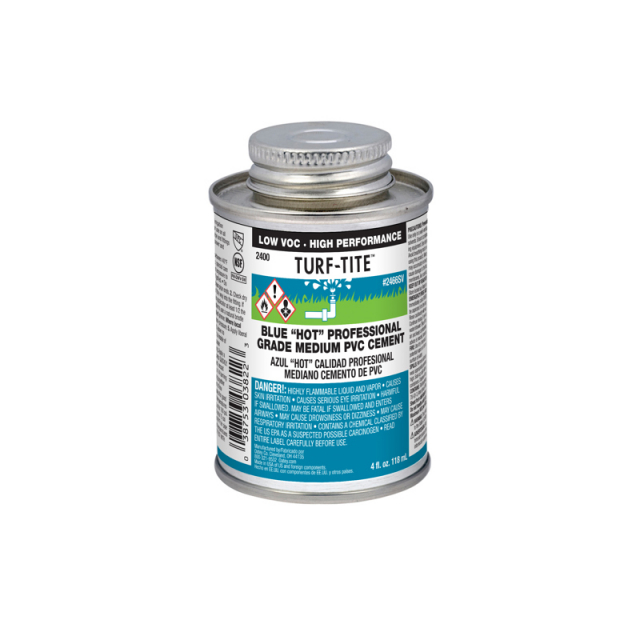 Oatey® PVC 2400 Series Turf-Tite™ Medium Bodied Very Fast Set "Hot" Blue Cement is recommended for potable water, pressure pipe and DWV applications. It is formulated for wet conditions and/or quick pressurization and fast installation. Oatey products have earned the trust of plumbing professionals for over 100 years.