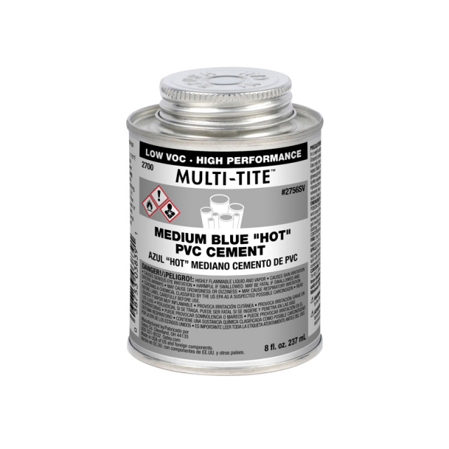Oatey® Multi-Tite™ 2700 Series Medium Blue PVC Cement is formulated for wet conditions or situations involving fast installation or pressurization of ABS, PVC and CPVC pipe and fittings up to 6" diameter with interference fit.