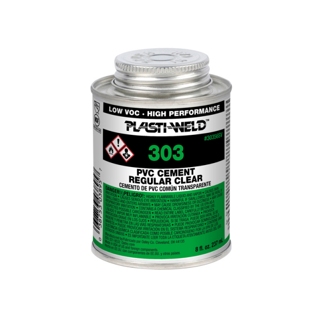Oatey® 303 Series Plasti-Weld™ PVC Regular Bodied Clear Cement is recommended for potable water, pressure pipe, conduit and DWV applications. It can be used on all schedules and classes of PVC pipe and fittings up to 6 in. diameter with interference fit. Oatey products have earned the trust of plumbing professionals for over 100 years.