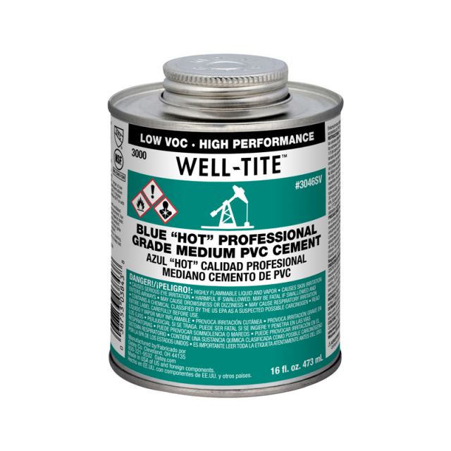 Oatey® 3000 Series Well-Tite™ is a medium-bodied blue cement formulated for wet conditions or situations involving fast installation or pressurization of flexible and rigid PVC pipe and fittings up to 6" diameter with interference fit.
