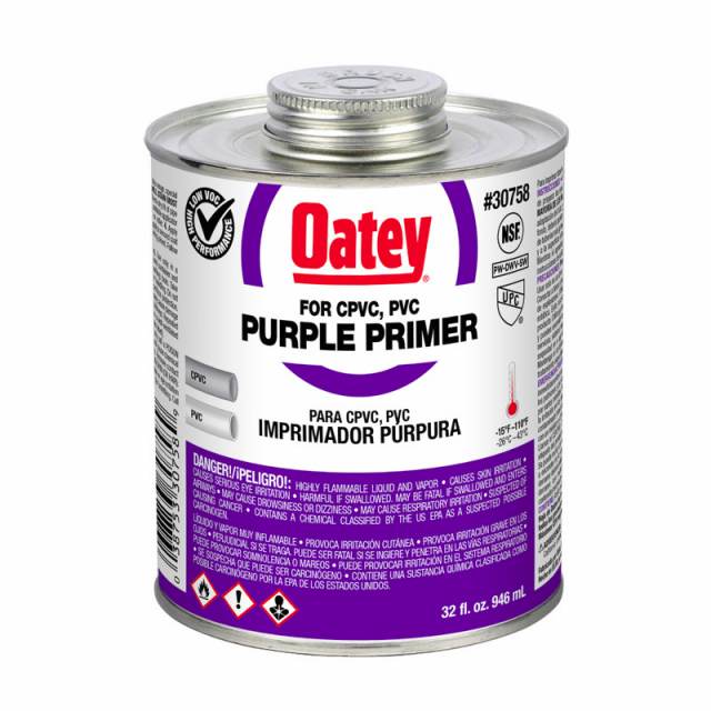 Oatey® Purple Primer is an NSF-listed, aggressive primer for use on all schedules and classes of PVC and CPVC pipe and fittings. It removes contaminants such as surface dirt, grease and grime as well as softens the pipe surface to allow for a fast, secure solvent weld. This primer's purple tint provides visible verification that a primer has been used, which is ideal for areas where plumbing code require this proof. It also applies easily with included in-lid dauber. Oatey products have earned the trust of plumbing professionals for over 100 years.