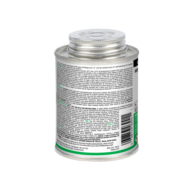 Oatey® PVC Heavy Duty Medium Set Clear Cement is recommended for DWV, pressure pipe, potable water and electrical applications. Its thick formula fills gaps in large diameter pipe and loose-fitting joints and is easy to apply with included in-lid dauber. This clear, heavy duty, medium set cement can be used to solvent weld all schedules and classes of PVC pipe and fittings with interference fit up to 18 in. diameter for non-pressure and 12 in. diameter for pressure pipes. Oatey products have earned the trust of plumbing professionals for over 100 years.