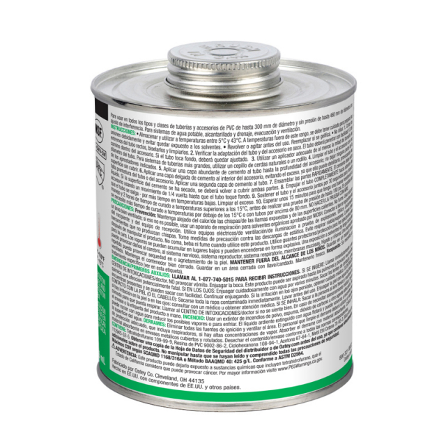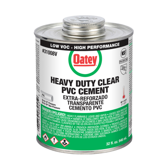 Oatey® PVC Heavy Duty Medium Set Clear Cement is recommended for DWV, pressure pipe, potable water and electrical applications. Its thick formula fills gaps in large diameter pipe and loose-fitting joints and is easy to apply with included in-lid dauber. This clear, heavy duty, medium set cement can be used to solvent weld all schedules and classes of PVC pipe and fittings with interference fit up to 18 in. diameter for non-pressure and 12 in. diameter for pressure pipes. Oatey products have earned the trust of plumbing professionals for over 100 years.