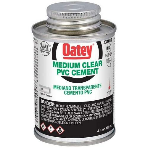 Oatey PVC Medium Bodied Fast Set Clear Cement is recommended for potable water, pressure pipe, conduit and DWV applications. It can be used on all schedules and classes of PVC pipe and fittings up to 6 in. diameter with interference fit. Oatey products have earned the trust of plumbing professionals for over 100 years.