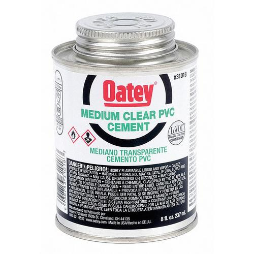 Oatey PVC Medium Bodied Fast Set Clear Cement is recommended for potable water, pressure pipe, conduit and DWV applications. It can be used on all schedules and classes of PVC pipe and fittings up to 6 in. diameter with interference fit. Oatey products have earned the trust of plumbing professionals for over 100 years.