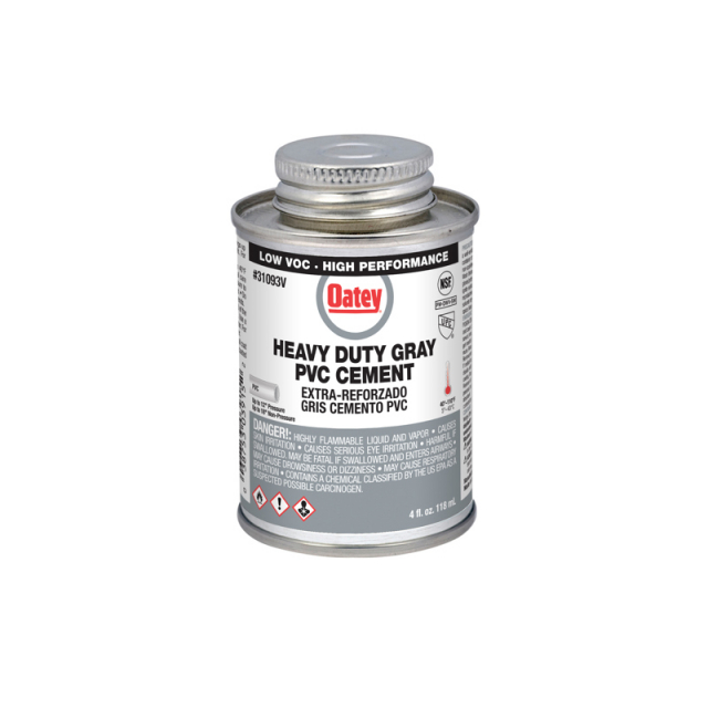 Oatey® PVC Heavy Duty Medium Set Gray Cement is recommended for DWV, pressure pipe, potable water and electrical applications. Its thick formula fills gaps in large diameter pipe and fitting joints and is easy to apply with included in-lid dauber. This gray, heavy duty, medium set cement can be used to solvent weld all schedules and classes of PVC pipe and fittings with interference fit up to 18 in. diameter for non-pressure and 12 in. diameter for pressure pipes. Oatey products have earned the trust of plumbing professionals for over 100 years.