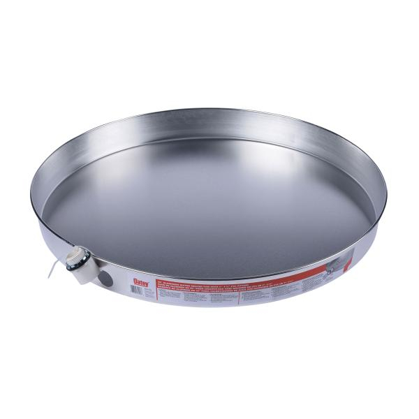Oatey 34153 is a 24in Aluminum Water-Heater Pan possible for installing underneath a gas/electric water heater for protection from water/moisture damage. Available with 1" PVC, 1-1/2" PVC or 1" CPVC drain fittings to allow for connection to indirect drains.