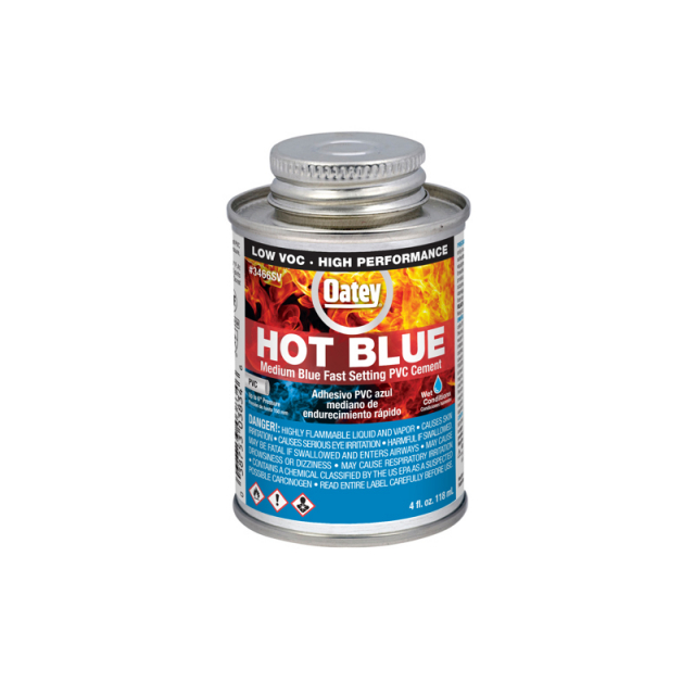 Oatey® Hot Blue is recommended for irrigation, pool and spa, and DWV applications. It is made for wet conditions, quick pressurization and fast installation, and is easy to apply with included in-lid dauber. This blue, medium body, fast setting PVC cement can be used to solvent weld all schedules and classes of PVC pipe and fittings up to 6 in. diameter with interference fit. Oatey products have earned the trust of plumbing professionals for over 100 years.