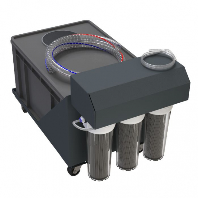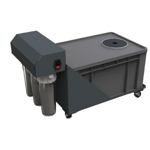Recirculating Filter System The RC-1000A portable recirculating filter system allows for polishers to be mobile as well as to filter and remove polishing swarf and abrasives generated from PACE Technologies NANO series polishers. Utilizing a positive pressure pump, the recirculating filter system is able to provide clean water containing 0.2 μm particles, thus eliminating waste flow to the building drainage system. The filtering process begins with a coarse filter to eliminate coarse materials such as ripped polishing pads or torn grinding papers. With a three chamber tank and counter current flow coarse abrasives can also settle when the pump is not activated. As water is required, the pump will engage and pull the effluent through a series of fine filters starting with a 1 μm filter, followed by a filter 0.5 μm and then to a 0.2 μm filter.