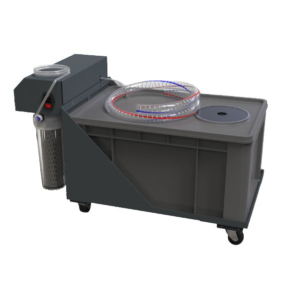 Recirculating Filter System The RC-1000A portable recirculating filter system allows for polishers to be mobile as well as to filter and remove polishing swarf and abrasives generated from PACE Technologies NANO series polishers. Utilizing a positive pressure pump, the recirculating filter system is able to provide clean water containing 0.2 μm particles, thus eliminating waste flow to the building drainage system. The filtering process begins with a coarse filter to eliminate coarse materials such as ripped polishing pads or torn grinding papers. With a three chamber tank and counter current flow coarse abrasives can also settle when the pump is not activated. As water is required, the pump will engage and pull the effluent through a series of fine filters starting with a 1 μm filter, followed by a filter 0.5 μm and then to a 0.2 μm filter.