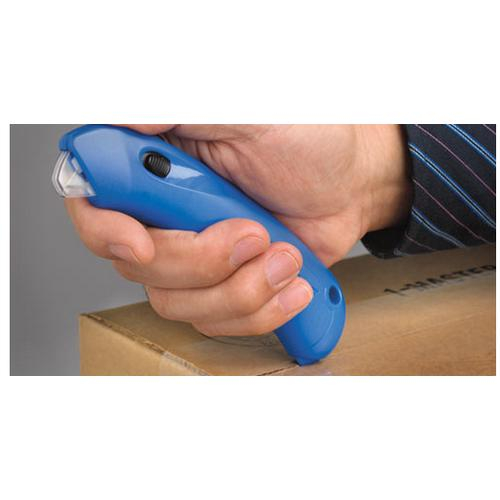 Don't be a Casualty of the 5 'o clock News! The E22202-4™safety cutter with a clear, see-thru guard protects and re-locks instantly after each cut. The hooded guard resets immediately after the cutter leaves the cutting surface.