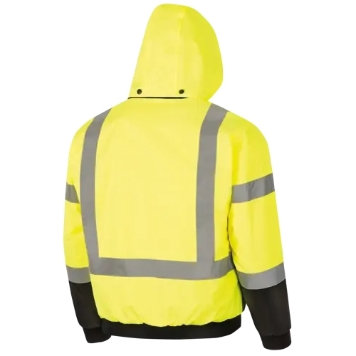 This insulated Hi-Vis waterproof 2-in-1 Bomber Jacket meets ANSI/ISEA 107-2020 Class 3 Type P and R requirements for those working in dangerous settings where visibility is the highest priority including EMS construction and traffic control. The StarTech® reflective tape and high-vis yellow/green shell provide excellent visibility. The jacket has a polyurethane-coated oxford polyester shell making it 100% waterproof and windproof. Worn as rain or snow workwear this heavy-duty jacket has a detachable snap hood with a concealed pouch and a removable inner fleece liner for flexible layering options. The 2-in-1 Bomber Jacket is designed with comfort and convenience in mind featuring a fleece-lined collar elastic-ribbed wrist cuffs and waist a black bottom to conceal soiling 2 radiophone clip straps an inner embroidery access zipper a full front zipper plus 4 pockets.