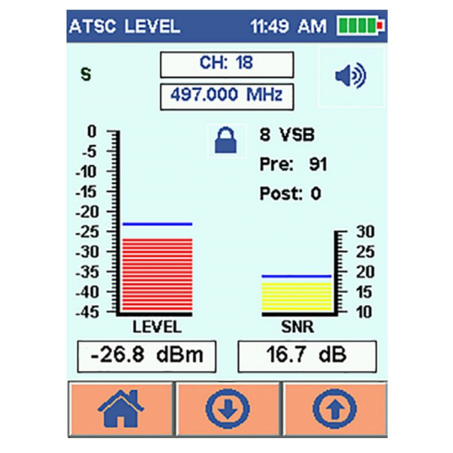 The SignalScout can be used to measure a single channel or an entire channel plan. There is also a learn mode to develop a channel plan for a specific location. The meter measures Signal level, Signal to Noise Ratio (SNR)/Modulation Error Ratio (MER), Tilt and provides Digital Error counts to verify the quality of the received signals and maintain or troubleshoot after installation.
