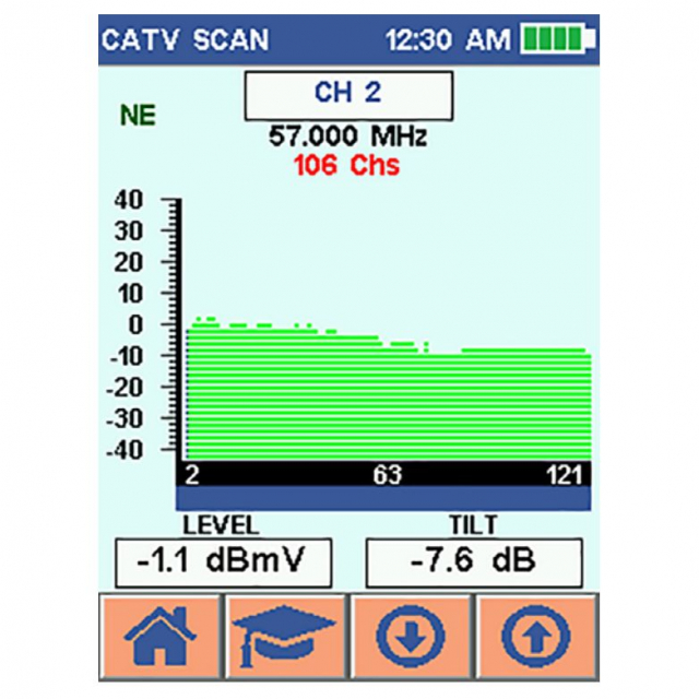 The SignalScout also verifies CATV service. The unit is 64/256 QAM fully compliant and DOCSIS 3.1 (OFDM) signal level compatible. Noise return power is measured through a 42MHz low pass filter.