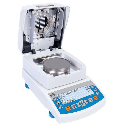 Moisture analyzer is a laboratory measuring instrument intended to determine relative humidity for small samples of different materials. Equipped with brand readable LCD display providing an extra text line for information such as supplementary messages and data, e.g. product name or tare value. The moisture analyzer, using respective pictograms, signalizes currently activated mode, computer connection and functions, both balance and service ones.