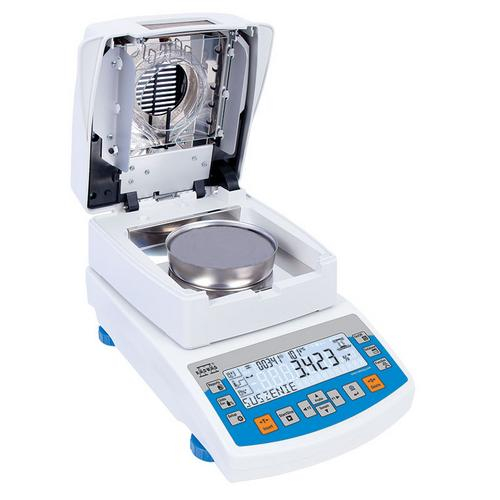 Moisture analyzer is a laboratory measuring instrument intended to determine relative humidity for small samples of different materials. Equipped with brand readable LCD display providing an extra text line for information such as supplementary messages and data, e.g. product name or tare value. The moisture analyzer, using respective pictograms, signalizes currently activated mode, computer connection and functions, both balance and service ones.