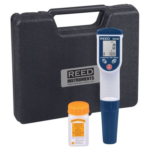 Digital pen-style meter displays both temperature and conductivity, total dissolved solids (TDS), or salt levels simultaneously on a dual LCD display. The R3530 features Data hold and Max/Min functions, Automatic Temperature Compensation (ATC), and a built-in calibration procedure.